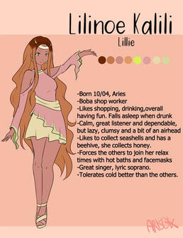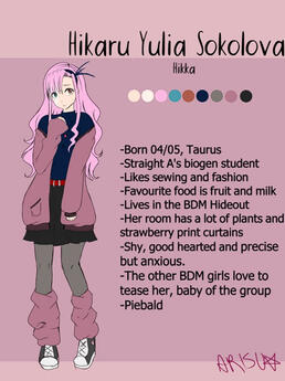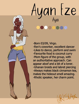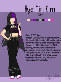 FleurFleur is Ayan's younger sister. Her accent is less strong than her, but you can hear that she's not a native. She dreamed of becoming an idol and after months of training, she joined Yemi's group under a dancer position even if sometimes she sings to add flavour with her lower register. She likes to go out, go to theme parks, concerts and such, even if she's not used to the fame yet and is still embarrassed when someone asks for a picture. Like Yemi, she also likes to model for Meki's fashion brand